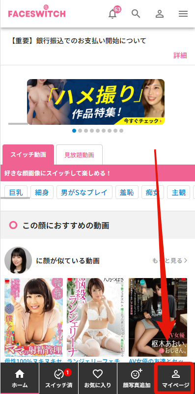 トップページの下部のメニューからマイページを選択 まずはFACESWITCHにログインし、画面下部に表示されているメニューバーの中から「マイページ」をタップして移動します 。